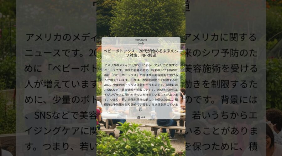 ベビーボトックス:20代が始める未来のシワ対策、NPR報道|NPR|2025/08/20|社会